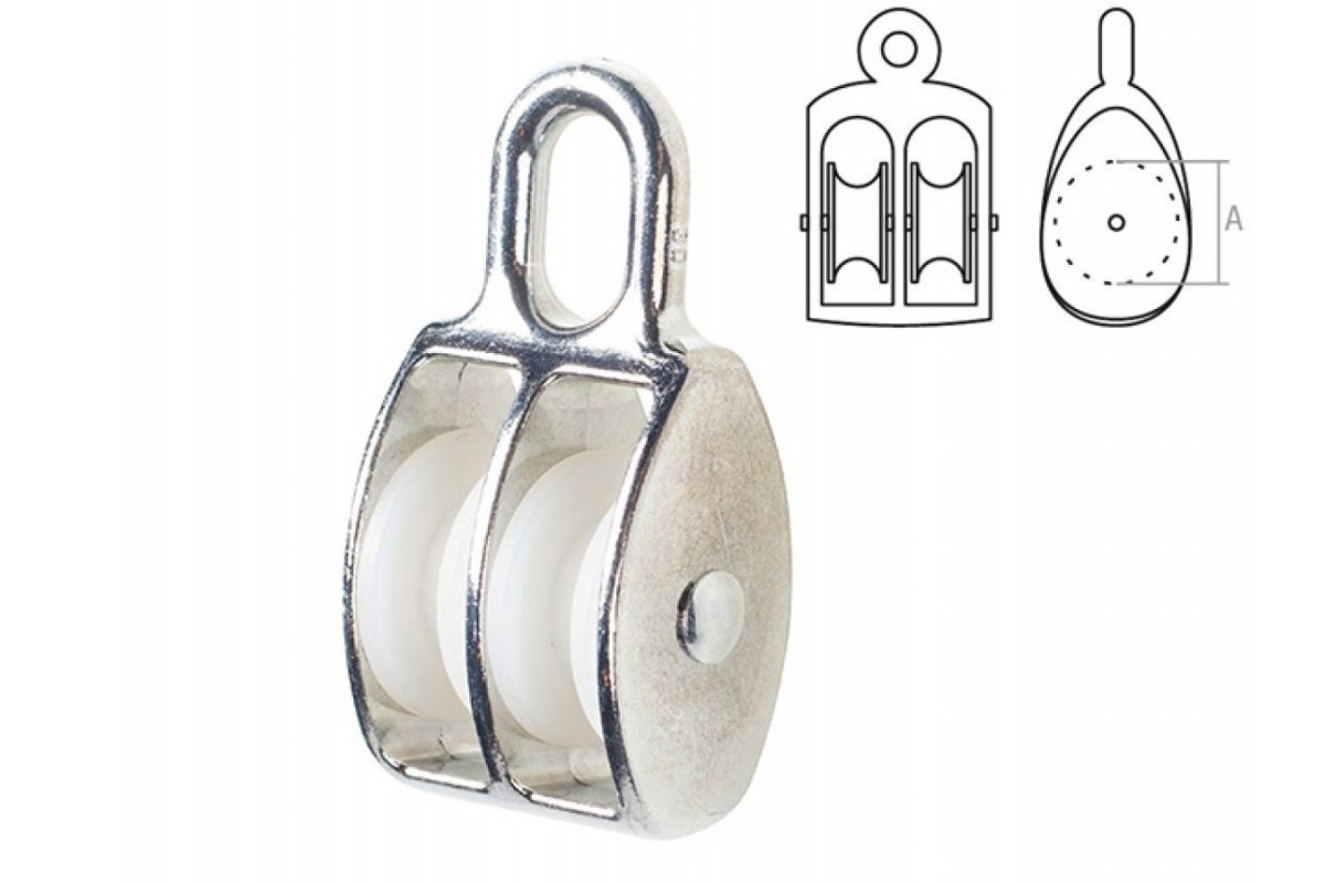 Максимальный диаметр применяемого троса - 12 мм Стальной оцинкованный блок с двумя нейлоновыми кольцами-шкивами применяется для изменения направления движения для неметаллических тросов, веревок и канатов, увеличения силы вгрузоподъемном оборудовании.