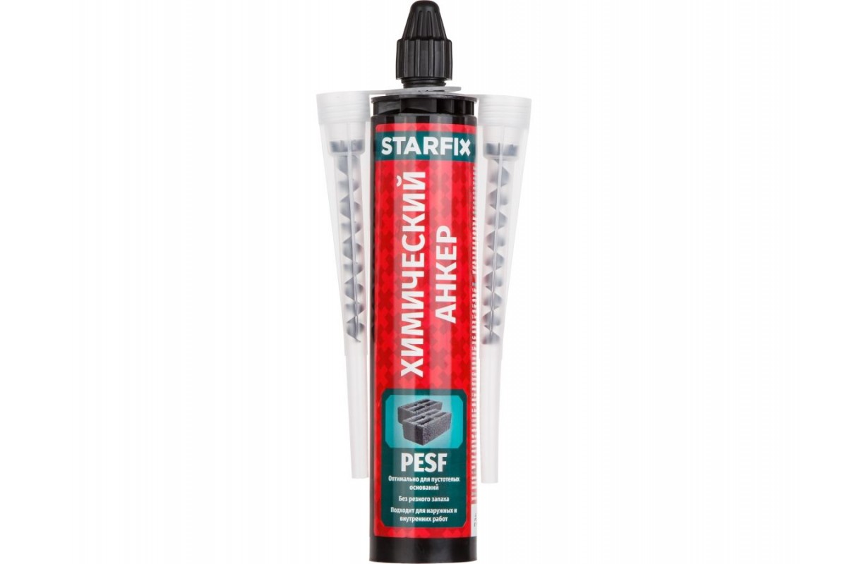 - для всех видов бетона и кирпича; - оптимально для пустотелых материалов; - для наружных и внутренних работ; - полиэстерная смола без стирола(без резкого запаха); - комплектация: 1 баллон, 2 носика-смесителя; - подходит для стандартного пистолета под герметик; Химический анкер PESF STARFIX - это высокоэффективная двухкомпонентная смола на основе полиэстера, не содержащая стирол. Специально разработан для крепления широкого спектра строительных материалов в основаниях из всех видов бетона и кирпича. Обладает повышенной вязкостью, из-за чего идеально подходит для крепления в газобетон, пенобетон, керамзитобетон и пустотелые материалы с применением сетчатых гильз. Анкерное крепление происходит с использованием резьбовых шпилек, фундаментных болтов, арматурных прутков и т.п. В рабочем состоянии образуется монолитное соединение равнопрочное материалу основания, при этом не создающее напряжения в этом материале. Позволяет выполнять установку анкеров вблизи края конструкции. Подходит для стандартного пистолета под герметик. Высокоустойчив к вибрациям и воздействию агрессивных сред. Температура установки: от +5°C до +30° C. Температура эксплуатации: от -40°C до +80°C.