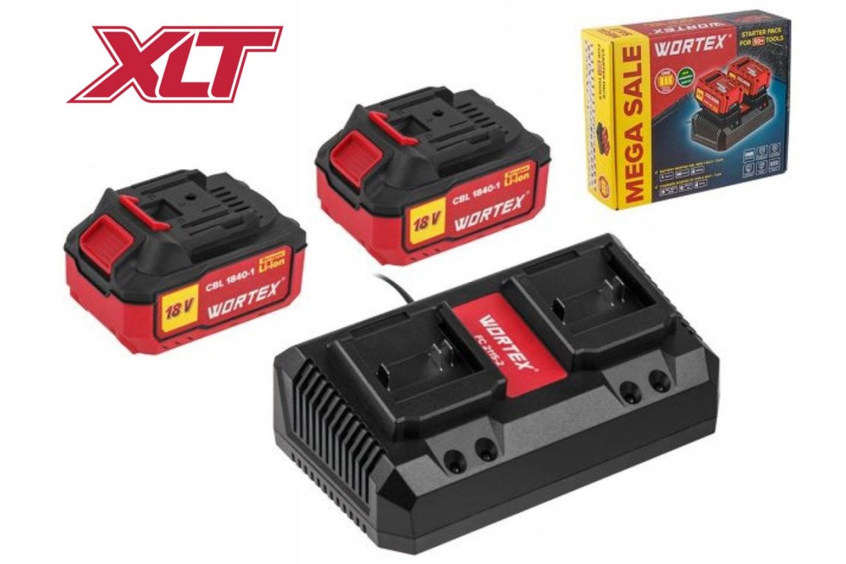 Стартовый набор для пользователей аккумуляторной линейки WORTEX XLT со скидкой в 16%! В набор входят 2 аккумуляторные батареи емкостью 4 Ач и двуслотовое зарядное устройство с силой тока в 2 А на каждый слот. Основные преимущества аккумуляторной батареи для линейки инструмента WORTEX на 1 аккумуляторе WORTEX XLT: 1) Технология высокотоковых элементов INR - устойчивы к перегрузкам и имеют больший ресурс при экстремальных нагрузках. 2) Защита от полного разряда батареи - остановит инструмент, если заряд батареи очень низкий. 3) Защита от перегрузки - остановит инструмент при сильной перегрузке. 4) Защита от перегрева - предотвращает перегрев инструмента и элементов батареи. 5) Обрезиненный корпус - защита от физических воздействий и большая устойчивость на поверхности. 6) Индикатор заряда батареи - поможет легко отследить уровень заряда аккумулятора. Технические характеристики CBL 1840-1: Напряжение: 18 В; Тип аккумулятора: Li-ion; Емкость аккумулятора: 4 Ач; Индикатор уровня заряда: есть; Технические характеристики FC 2115-2: Параметры сети: 100-240 В 50 Гц; Выходное напряжение: 18 В; Выходной ток: 2,0 А х 2,0 А; Кол-во слотов для аккумуляторов: 2; Гарантийный срок - 12 месяцев;