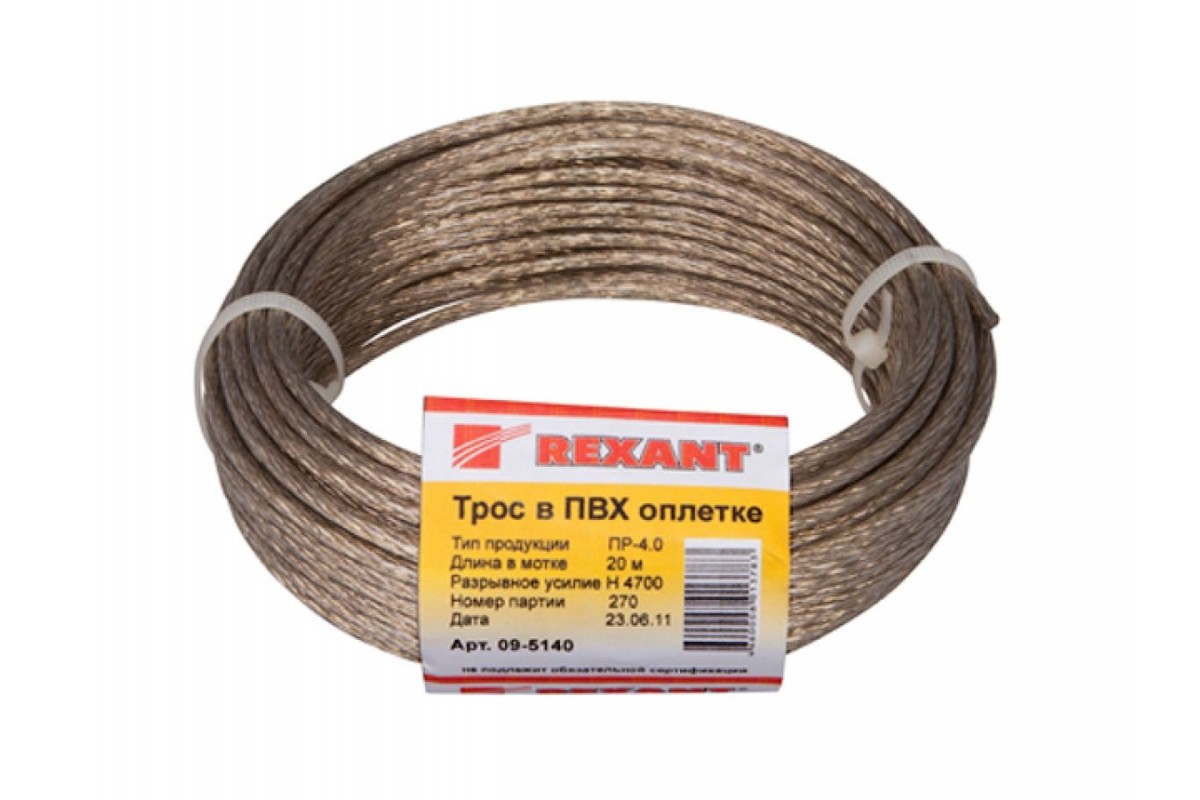 Трос стальной в ПВХ оплетке d=4,0 мм, прозрачный ( моток 20 м) REXANT